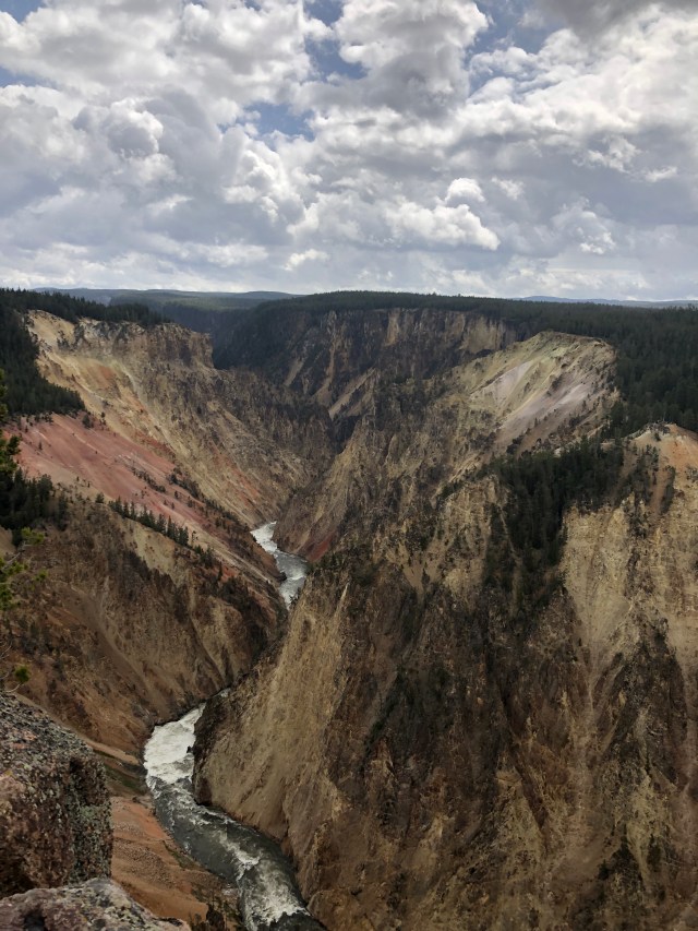 We got to the Grand Canyon of Yellowstone. If you’ve never been here before, it’s this beautiful canyon that has the wildest combination of colors in the rock. We took the North Rim road to view the canyon. The road to take you to the canyon is one-way, so once we were in, we were in! Scott wanted to walk down to see the Lower Falls. It was a 600 foot drop, so the way down was easy, but the way up was steep. It was really cool though, as we were literally right at the edge above the Lower Falls. Scott was terrified! I laughed a lot watching this. We also looked at the Grand View, which wasn’t the best view, and also Inspiration Point which was awesome!