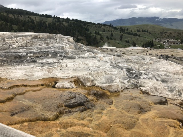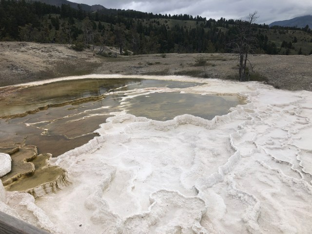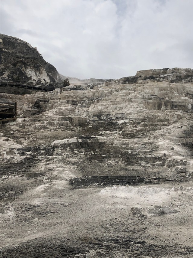 Mammoth Hot Springs has a lot of history behind it. According to their trail guide, for hundreds of years the Shoshone and Bannock people collected minerals from the springs for white paint. The heat source behind the springs is a mystery to scientists, who have proposed two sources; the magma chamber below the Yellowstone Caldera, or a smaller heat source closer to Mammoth. There is an underground network of fractures that allow hot water to reach the surface. The limestone in the surrounding area is dissolved as carbonic acid rises to the surface, which then creates calcium carbonite that is deposited in the form of travertine. This travertine forms terraces of Mammoth Hot Springs. There are millions of thermophiles in the springs, which produce the varying colors around the springs. This is a common occurrence at Yellowstone in all of the springs and geysers. The travertine is produced rather quickly, so Mammoth Hot Springs is constantly changing. Some springs are dormant, while others are not. Some of the springs that we saw, were not in existence 20 years ago. This is pretty cool and I look forward to coming back and seeing the changes.