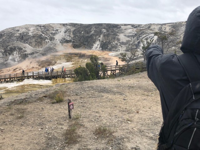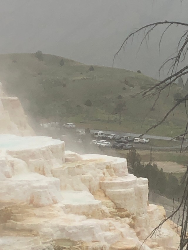 We then headed north to the Mammoth Hot Springs in the northwest corner of the park. We stopped off at a Petrified Tree at Scott’s request. It was totally not worth it! Neither of us even took a picture! We got to Mammoth Hot Springs, and arrived in the little town right next to it. There were elk walking through the town, and tons of people. We found a parking spot, and headed off to see the springs. Scott, still not feeling great, led the way to go uphill first in taking the hundreds of stairs.