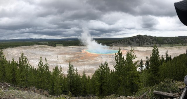 Our last sighting of the day was to go back to the Grand Prismatic Spring. Scott had done some research the night before, and we felt confident that we could find the trail that would lead us above the spring. This proved much easier than the previous day, as there were SO many more people around. We could actually see people on the trail from the road, where we hadn’t seen them the day before. We took the trail up, and finally saw the cool sights we had so desperately wanted to see. It was our last day in Yellowstone, and we felt good about what we had seen, and are already making our list for the next visit.