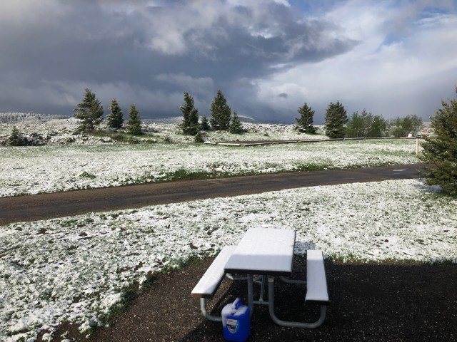 So, this was an interesting day. We went to bed at Henrys Lake State Park in Idaho, it was cold but tolerable. We woke up to SNOW. Like, an inch of it! The weather disturbed the electricity at the campground, so we had no electric or city water when we woke up! It was crazy!