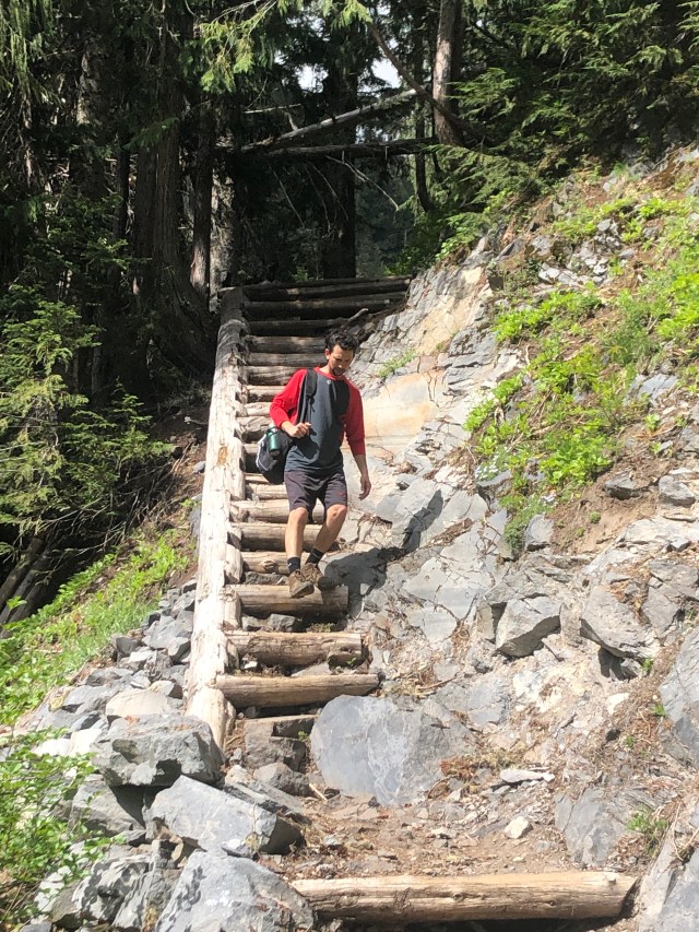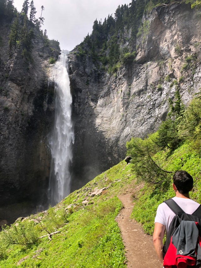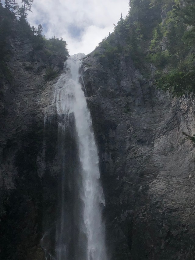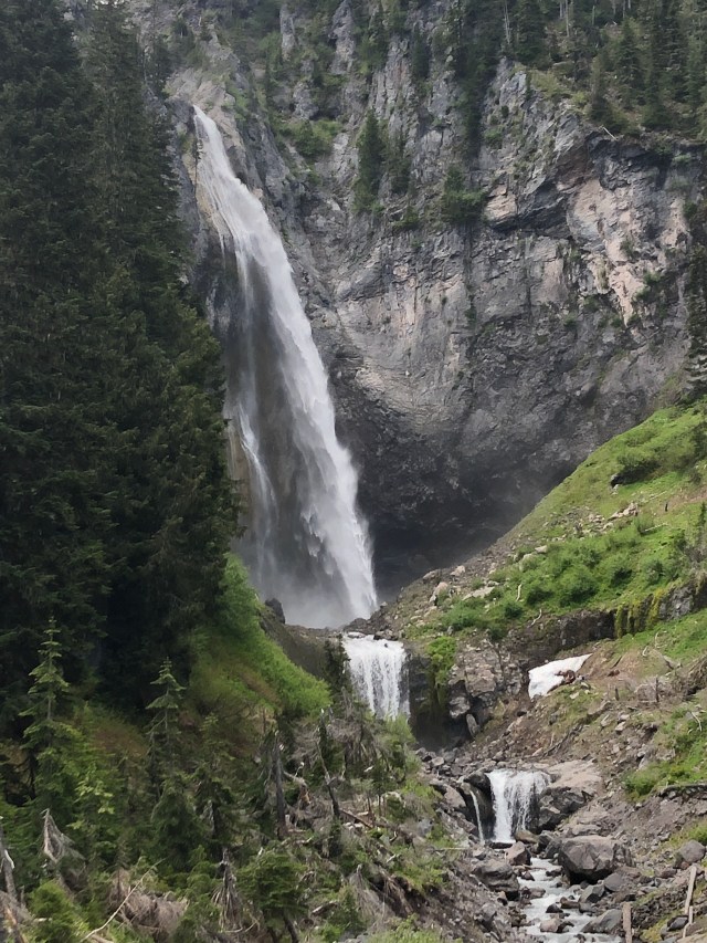 We arrived at Mount Rainier, easily got a campsite, and were off to explore the park. Scott wanted to do a hike to a waterfall called Comet Falls. According to our national parks book, this was a 5 mile round trip hike to a waterfall and back. We knew there would be some elevation gain, but didn’t anticipate how difficult the hike would be! We traversed hills, boulders, a stream, a wooden staircase, and a huge amount of elevation. However, it was 100% completely worth it. (I joked with Scott that this was his payback for me making him hike to Akupuni Falls in Glacier National Park, which was a pretty difficult hike as well). Check out these pictures of the falls! We were able to almost get to the bottom of the falls- I’m sure we could have gotten there if we had really wanted to.