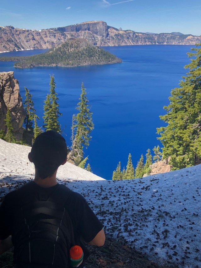 We decided to unhitch the camper to give us more ease of travel through the park. Now, we knew that the full Rim Drive was closed still due to snow, and we would only be able to get to a certain part of the park. What we didn’t know was that ALL of the hiking trails were also closed! We had planned to hike to the summit of Mt. Scott, because hello! We were already a little bummed about the campground, so this didn’t bode well for us. We drove up to Rim Village, and walked around for a little while to look at the lake.