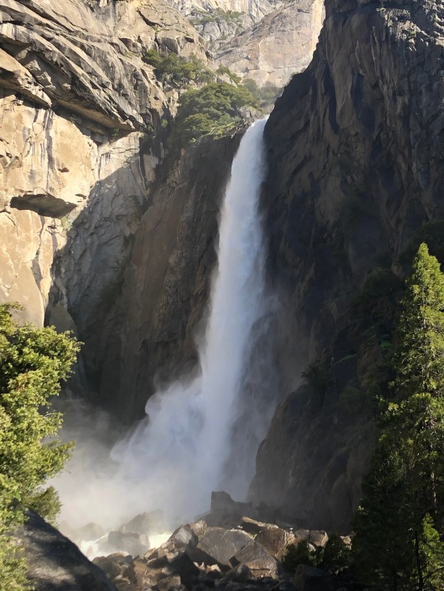 We parked in the valley, and started walking toward the Lower Yosemite Falls. Our destination for the day, or what we were hoping to get to, was the top of Upper Yosemite Falls. To get to Upper Yosemite Falls, you have to hike a little over 3 miles one way, up 3,000 feet of elevation! We started the hike up, doing switchback after switchback. There were TONS of people on this trail, which really surprised me! The hike was pretty rough, and I wasn’t feeling the best on this particular day unfortunately. We made it about 2/3 of the way up, to Columbia Rock, where we decided to sit for a while a take a break. Neither of us were entirely sure we were up to the task of climbing another 1,000 feet up. We spoke to a few people who were on their way down at this point of the morning, and got mixed reviews of how hard the hike would be (one person said she hikes it all the time, and it takes her an hour and a half to go up and down! No way could we do that! It took us about an hour to get to the point we were currently at!)