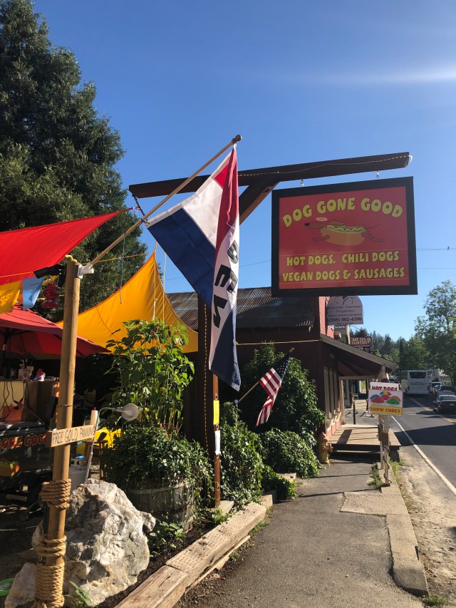 We headed back toward our campground, stopping in the city of Groveland. Groveland is home to the oldest operating saloon in California. I made Scott stop for a drink (much to his protest). We had planned on cooking dinner back at the camper, but walked past a place called “Dog Gone Good.” Basically, this guy had a grill and tables/chairs on his front lawn and ran a business! Scott really wanted a hot dog, but I don’t think he expected that the hot dogs would be massive! There went our dinner plans! We headed back to the camper to shower and turn in after the long day!