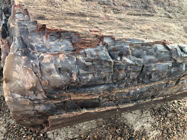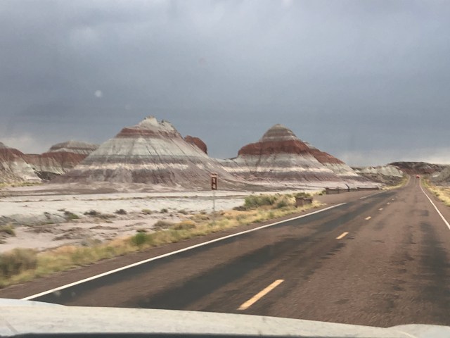 We made our way to Petrified Forest National Park. This national park is extremely unique. There is one road through the park and it is conveniently located where you exit the highway, take the road, and end up back on the highway! The national park is named for the large deposits of petrified wood in the desert. These petrified trees date back 225 million years go. They are preserved under mud and tar and other things. Eventually, the wood petrifies and calcifies. It’s crazy to see because you can see how they used to be trees (they still look like fallen logs!) but they are filled with a rainbow!
