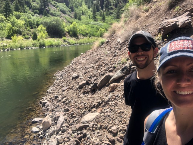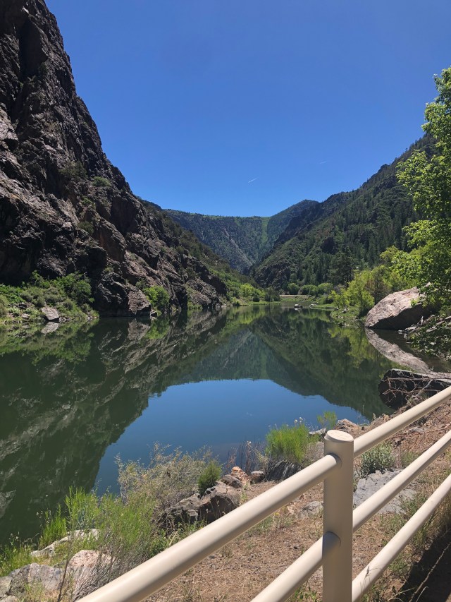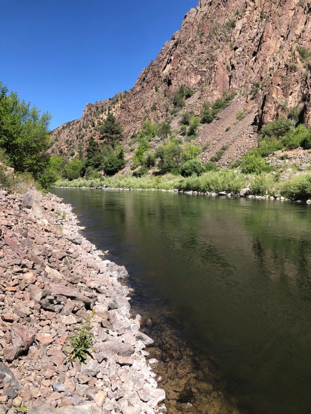 The Uplands Trail brought us back to the Rim Rock Trail, which led us back to the campground. We were both a little (or a lot) sweaty and tired. We rested for a little while, but then got into the truck and headed to East Portal Road. This is a 6ish mile road with a 16% grade that takes you all the way down into the canyon and by the Gunnison River. At the end of the road, there is a dam and the Gunnison Tunnel (under water). There were a lot of signs that talked about when the tunnel was built, and how. The signs really never explained the purpose of the tunnel, however. We climbed down the side of the hill and sat next to the river for a little while, enjoying the sun and the water and watching the fishermen.