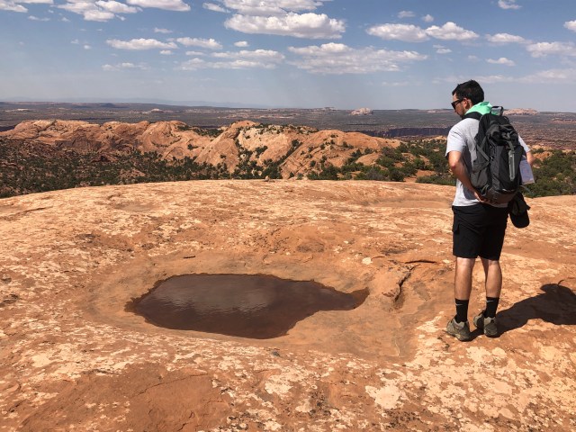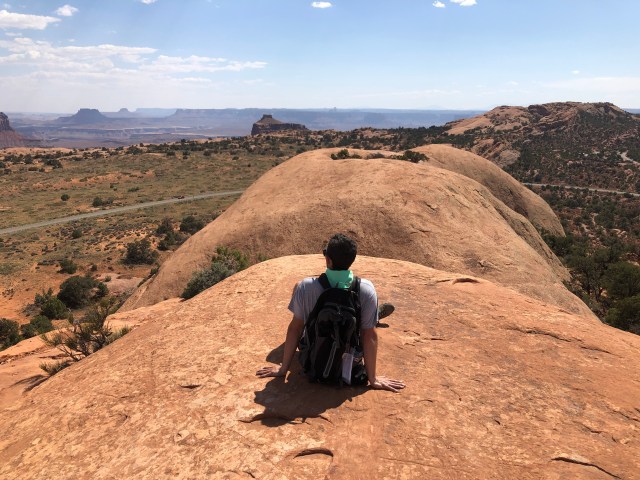 After Mesa and Washer Woman, we drove up the scenic drive some. There was something called Whale Rock, and Scott pulled over. We had no idea what it was, so we wanted to check it out! It turned out to be a really cool 1 mile hike in which we scaled this MASSIVE rock (I mean, it’s called Whale Rock for a reason). Canyonlands is super windy, so we kept having to take our hats off or risk them being blown off! This hike was really fun and a must-do if you come to Canyonlands!
