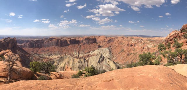 We got back in the truck and headed for our last hike of the day, Upheaval Dome. Upheaval Dome is a 3 mile wide crater in the ground with unknown origins. There are two major theories behind it: Erosion of a salt dome, or a meteorite impact with erosion occurring afterwards. Either way, pretty cool. There are two viewing areas. The first is about a mile hike, the second one is about two miles. We decided to do both! We got some great views of the crater. This hike was a little strenuous and you have to be comfortable climbing and scaling rocks!