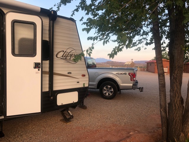 Our check in time for our campsite is 12:30, and the drive is short, so we dilly dally a little in the morning so we don’t arrive too early. The drive into Utah is beautiful! Desert and rocky and hot, but beautiful! We are staying at Archview RV Resort, which is right on route 191. This is super convenient as Arches is less than a 10 minute drive and the road to get to Canyonlands is right across the street from us! We normally don’t like staying at RV resorts (our experience last summer at Yosemite was much less than ideal), but all of the campsites inside the national parks were full when we booked-and they are also completely closed now due to COVID-19! We lucked out that we had to choose somewhere to stay outside the park. This campground is super clean and convenient, has full hook ups (which is awesome so we can use the air conditioning!), and even has showers and laundry for us to use! If you don’t have a camper, you can tent camp or rent a little house thing to stay in!